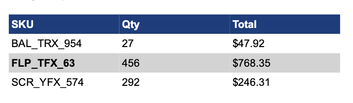 "data": [["SKU", "Qty", "Total"]]