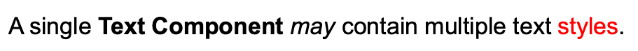 An example text component with multiple formatting styles is shown below. Notice that there is a style applied to the base component as well as some of the individual textElements. These styles will be combined by the rendering engine so that all textElements are affected by the base component style.
