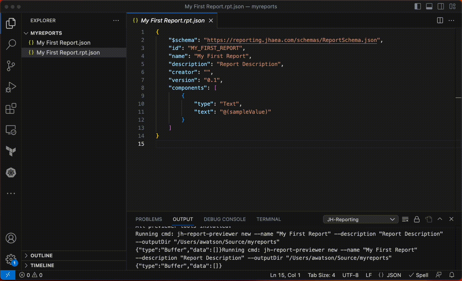 The JH-Reporting engine will output status, information and errors in VS Code. This is helpful for viewing errors, seeing report render progress and troubleshooting layout problems. To view output: 1. If the output window is not already visible, go to 'View' menu, then 'Output' 2. Select ‘JH-Reporting’ in the drop-down menu on the right