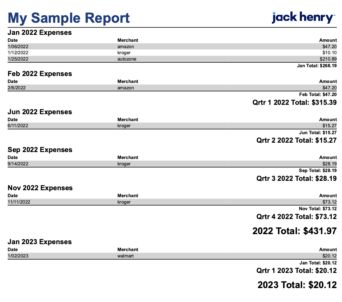 A common building block of report templates is the ability for layout components (Row, Column, Grid and Inline) to include data queries. The dataQuery element in each of these components allows for refining data and repeating one or more components for each occurrence of a specific data element. Consider the following report that displays sales information grouped by month, quarter and then year: